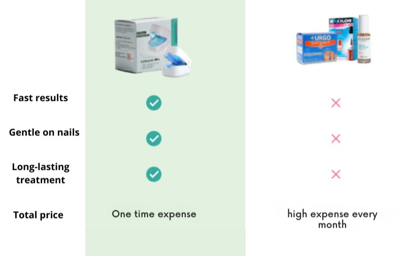 I modsætning til konventionelle behandlinger, målretter vores apparat svampen i dybden for en hurtigere og varig helbredelse.